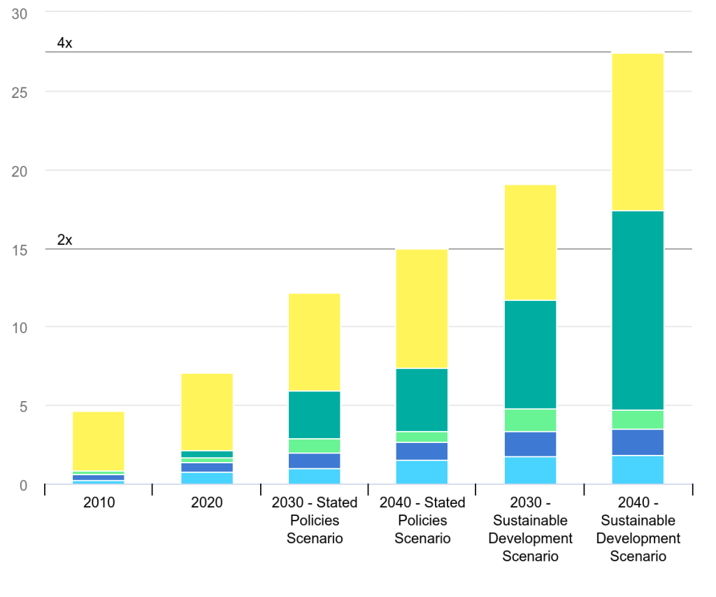 IEA, Total mineral demand for clean energy technologies by scenario, 2010-2040, IEA, Paris https://www.iea.org/data-and-statistics/charts/total-mineral-demand-for-clean-energy-technologies-by-scenario-2010-2040-2, IEA. License: CC BY 4.0