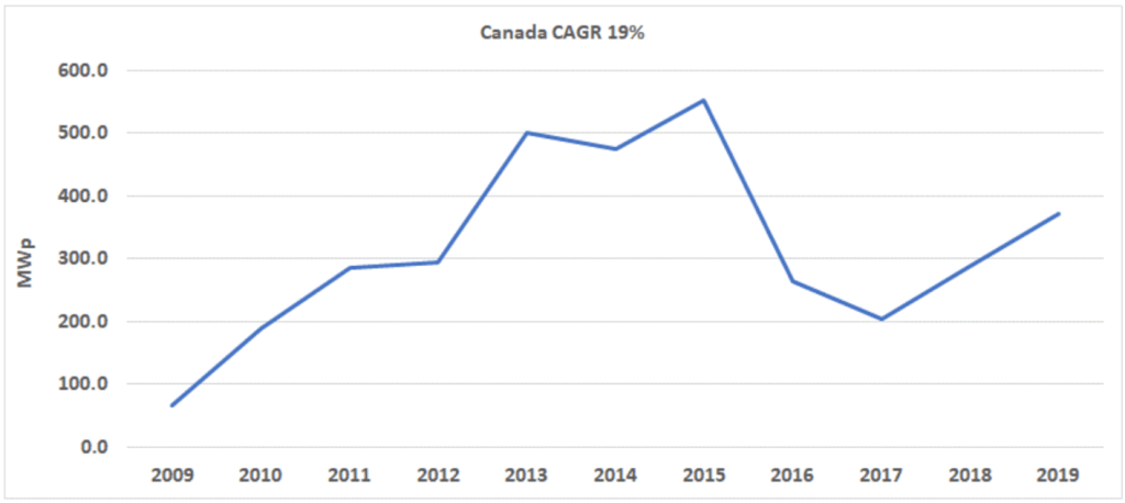 When Ontario first announced its FiT, it expected gigawatts of deployment. Though installations in Canada did increase, mainly in Ontario, deployment was primarily rooftop and far below expectations. Figure 1 depicts solar growth in Canada from 2009 through 2019. Deployment is, again, primarily in Ontario.